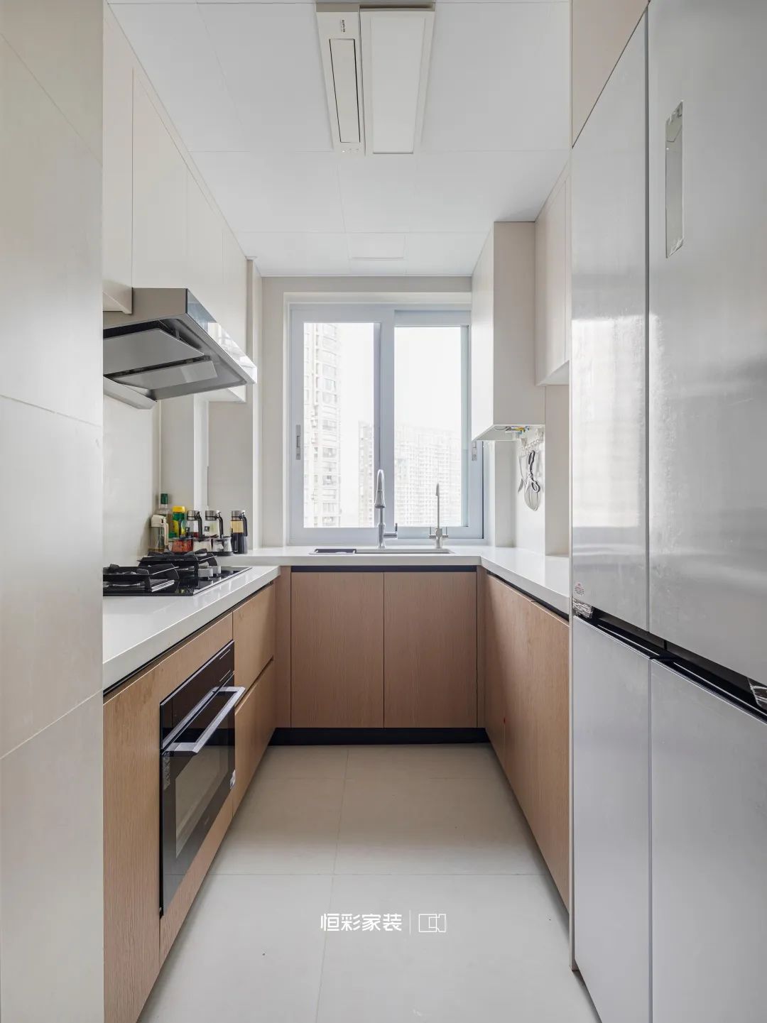 吊柜是收纳的诗篇,拾起生活琐碎却又不染尘埃,右侧冰箱宛如时光宝盒,守望年岁日长,典藏季韵悠香。