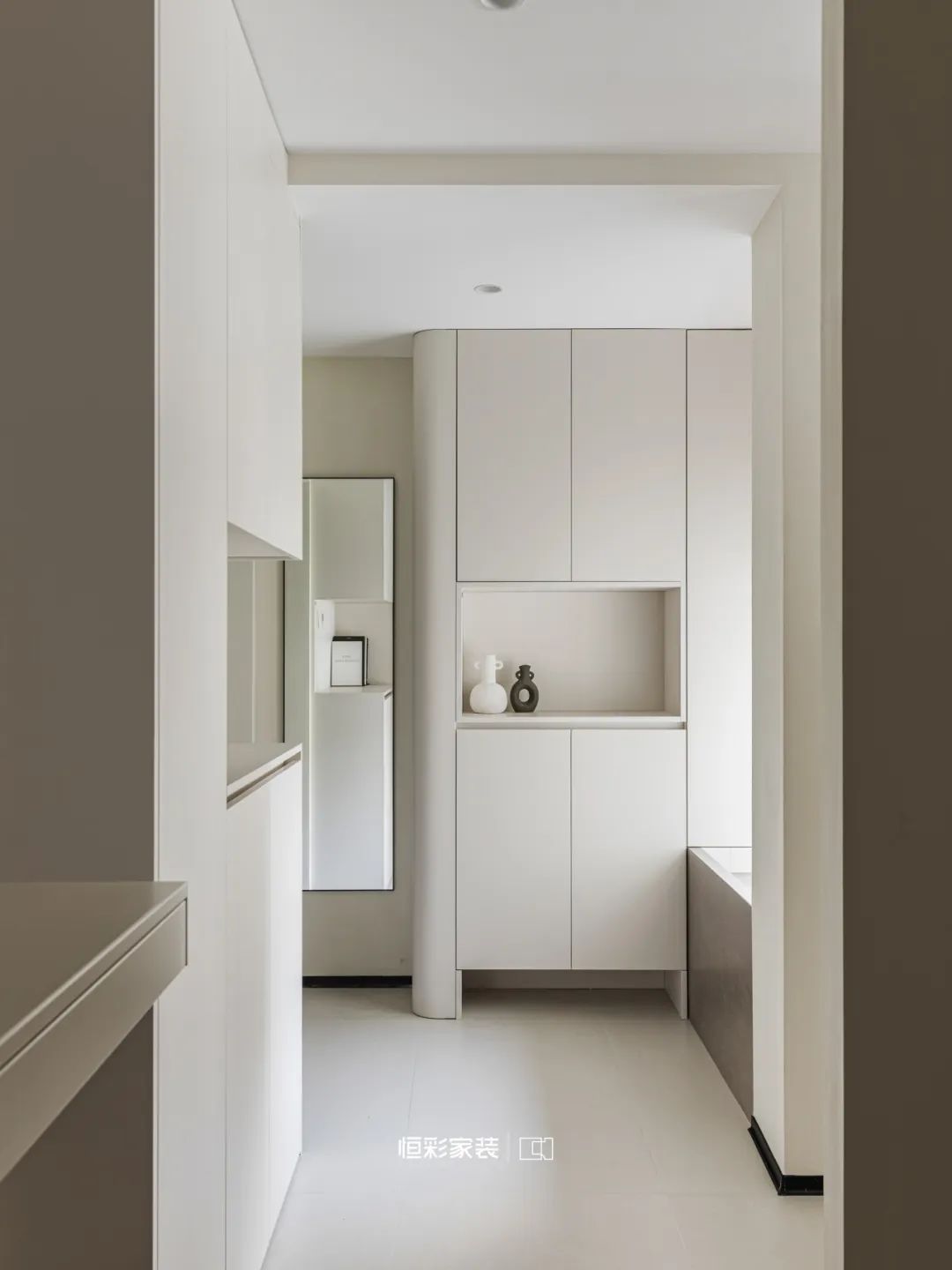 家门轻启,白色玄关柜轻柔迎接归来的旅人,填补空间留白,无痕柜门温暖归家的视线。