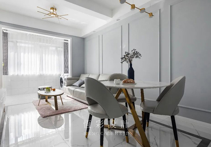 清一色的背景墙配色,搭配简单的石膏线条装饰。家具选择以简约为主,金属元素的装饰很好地起到点缀作用。