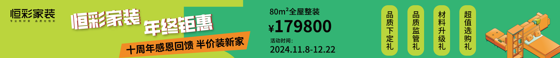 从11月12日至12月28日,为期一个多月的年终钜惠活动,我们准备了覆盖 “定金、签约、升级、换购” 等全环节的多重福利,让业主既能放心把家交给恒彩,又能实实在在省下装修预算,让品质家装触手可及。