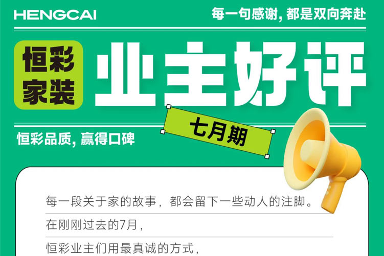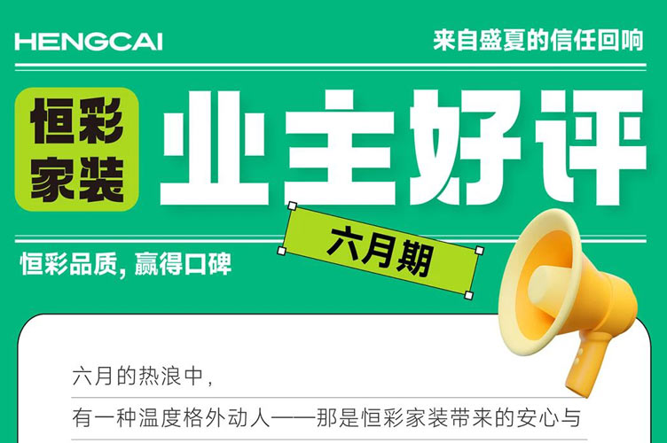 六月的热浪中 有一种温度格外动人--那是恒彩家装带来的安心与 信赖。 从图纸到交付,从构想到实景,一声声来自业主的认 可好评,是对恒彩品质整装最真切的回应。 这些好评,跨越屏幕、平台与时间,汇聚成一份沉甸 甸的肯定,也是一份份写给家的情书,