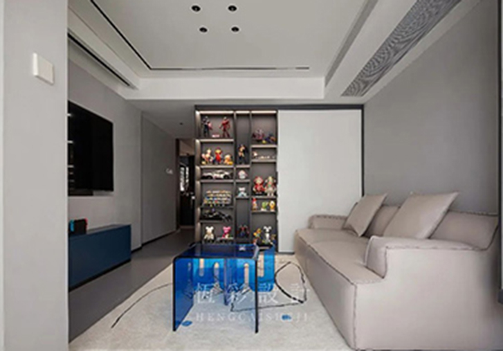 客厅靠墙设计一整面的柜体,玻璃展示区依旧是模型手办,推拉移门隐藏着一整面的零食柜。因为设计师的工作原因,多囤些食物更有安全感。