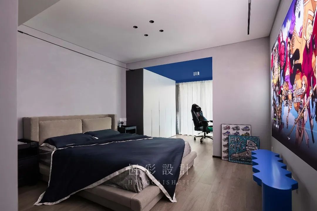 主卧休息区做了常规的布置,保证空间的功能性。墙面留白用作投影,改变传统的电视机上墙,时尚感更佳。