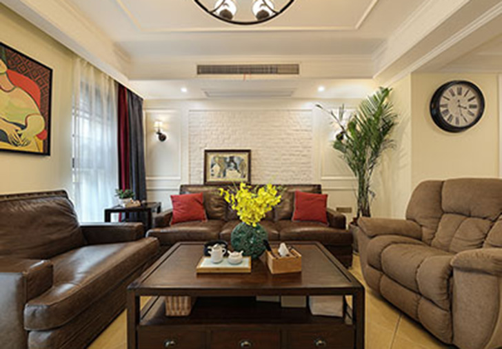 美式风格家具多用材实木,棕色的实木家具以及同色的皮质沙发,简洁明快,质感做旧,具有历史感。搭配同样深色的软装窗帘,整个客厅宽敞而富有历史气息。