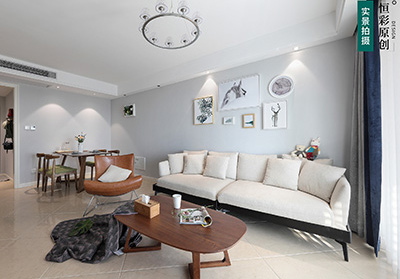 浅灰色的客厅主色,清新素雅,搭配蓝色的电视机背景墙,蓝白色的几何图形拼接,简单,大方,清雅。室内的顶、墙、地三个面,完全不用纹样和图案装饰,只用线条、色块来区分点缀。