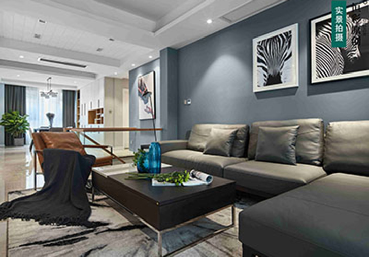 客厅主色为蓝灰色,搭配浅灰、深棕色的家家具,带给人一种沙哑又不至于失声的魅惑。