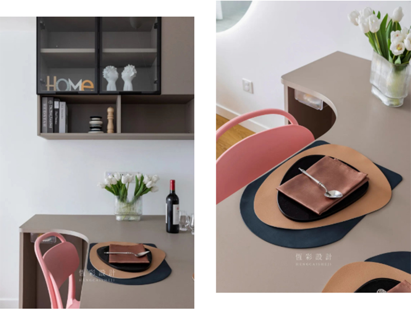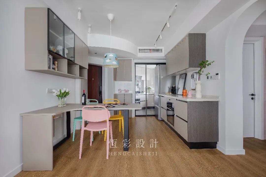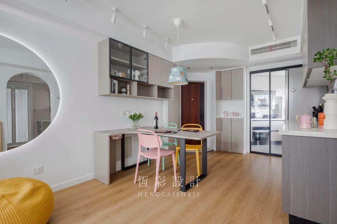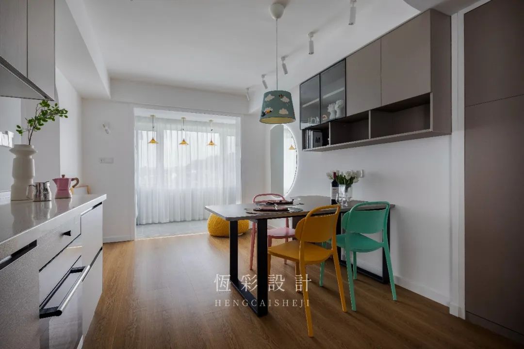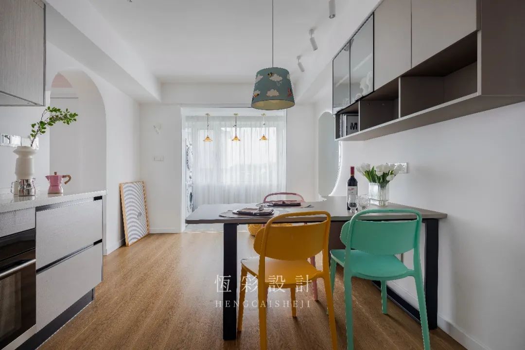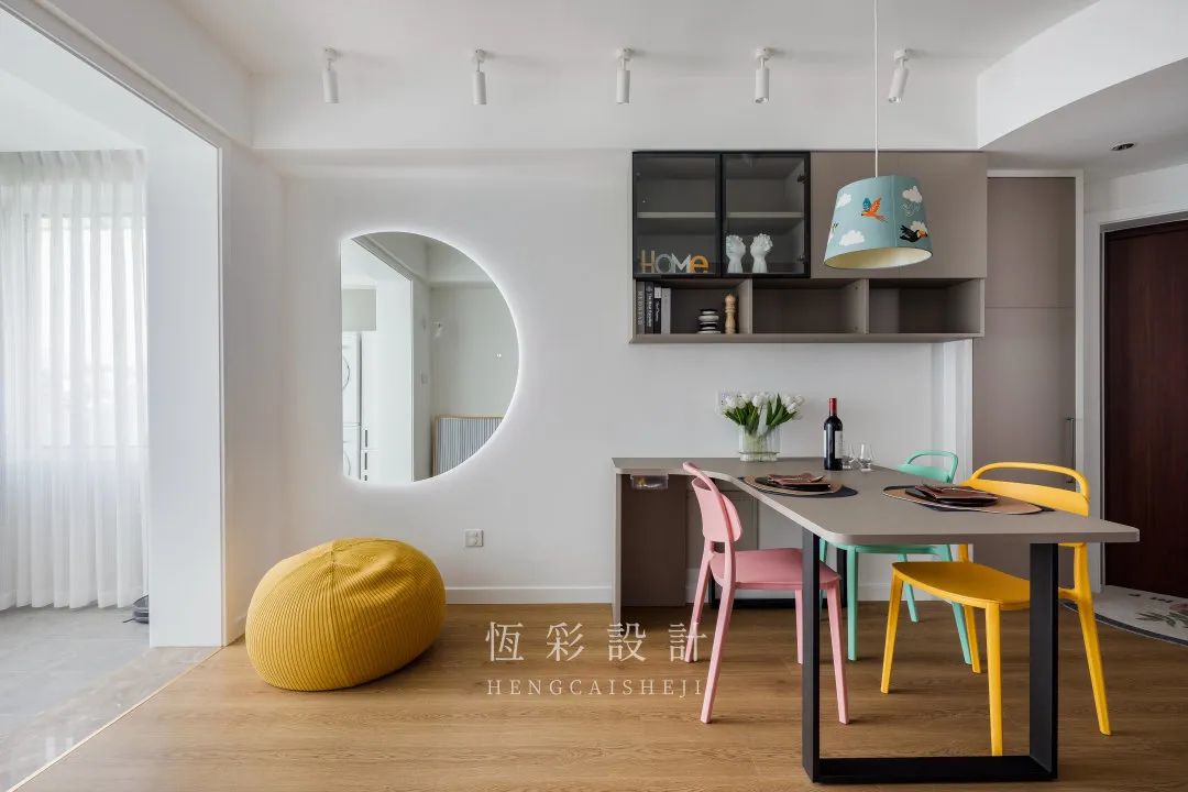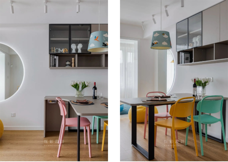 餐桌的色调是为协调餐边柜门,而餐椅的配色则显得俏皮不少。粉、黄、绿以及餐厅灯的蓝调,更衬出空间的轻快氛围。