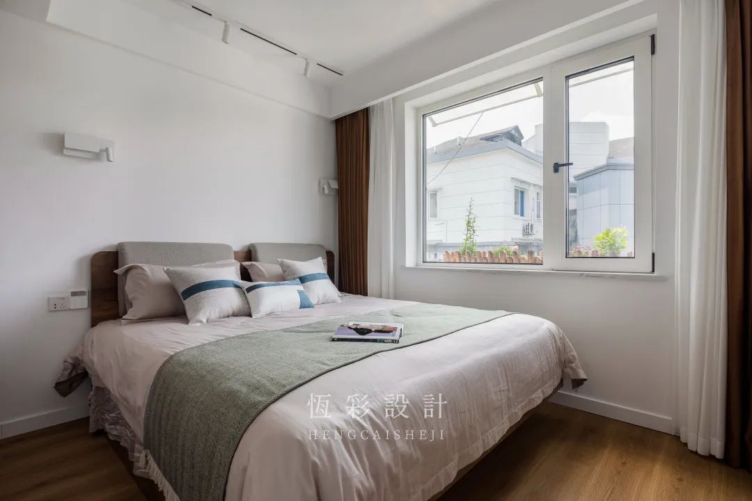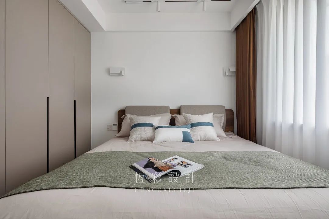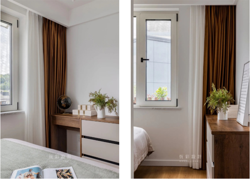 床尾的成品桌用于简单置物,选取与窗帘相似的深木棕调,气质沉稳、高级。