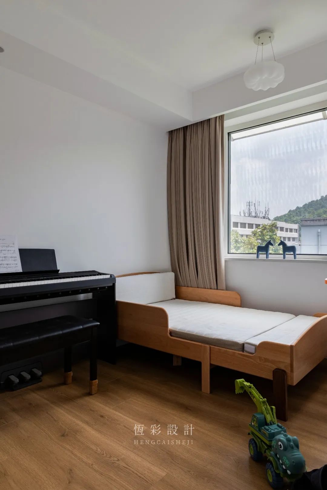 黑色钢琴落于床边,目前是屋主的娱乐,日后也可以顺带开发孩子的喜好。