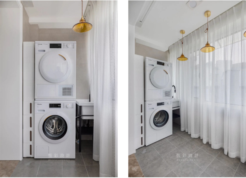 一端靠墙叠放[Miele]洗衣机、烘干机,并于空处塞下成品收纳,方便物品放置,靠墙则作洗水池,小空间完成生活功能。