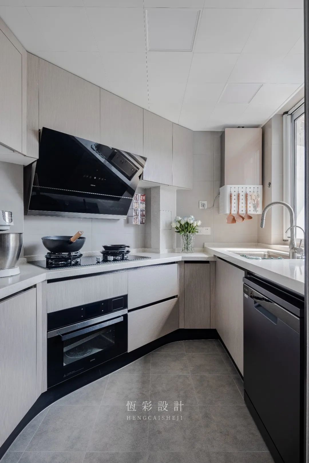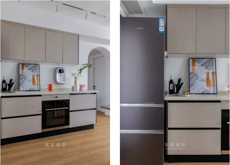 同样是[橱柜]定制的橱柜,与餐边柜色调统一,形成隔空的呼应。