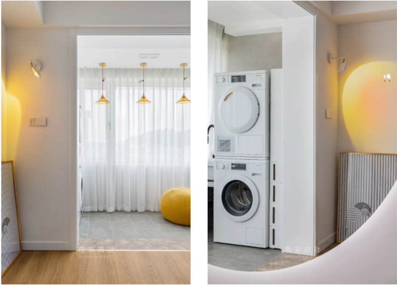 隔墙安装暖调落日灯,光打在留白的墙面,与阳台的三盏琥珀灯、柠檬黄懒人沙发共同营造出一个暖融、惬意的小空间。