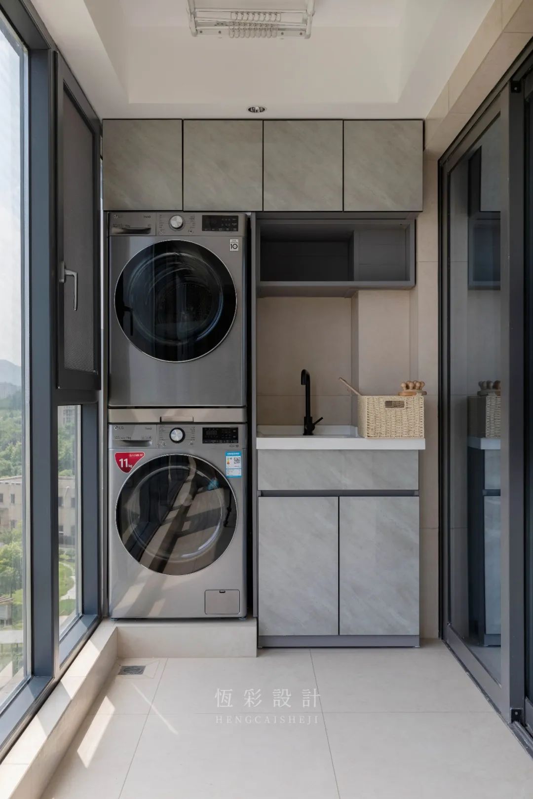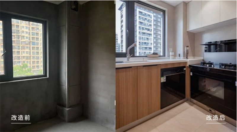 生活区增加地台抬高设计,叠放[LG]洗衣机、烘干机的同时也让旁边的水槽区空间更大,上下留空部分则做柜体填充,实用性满分。