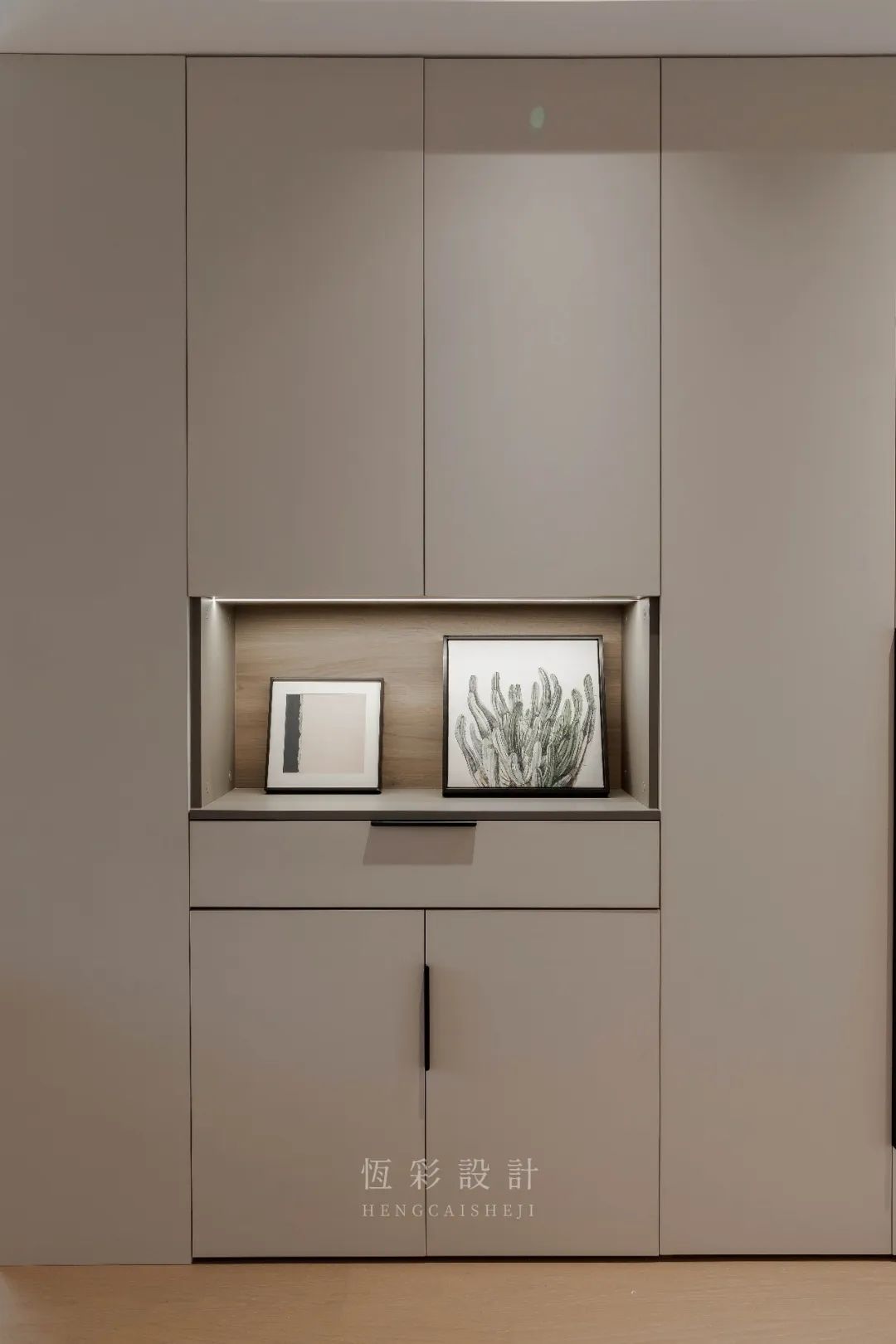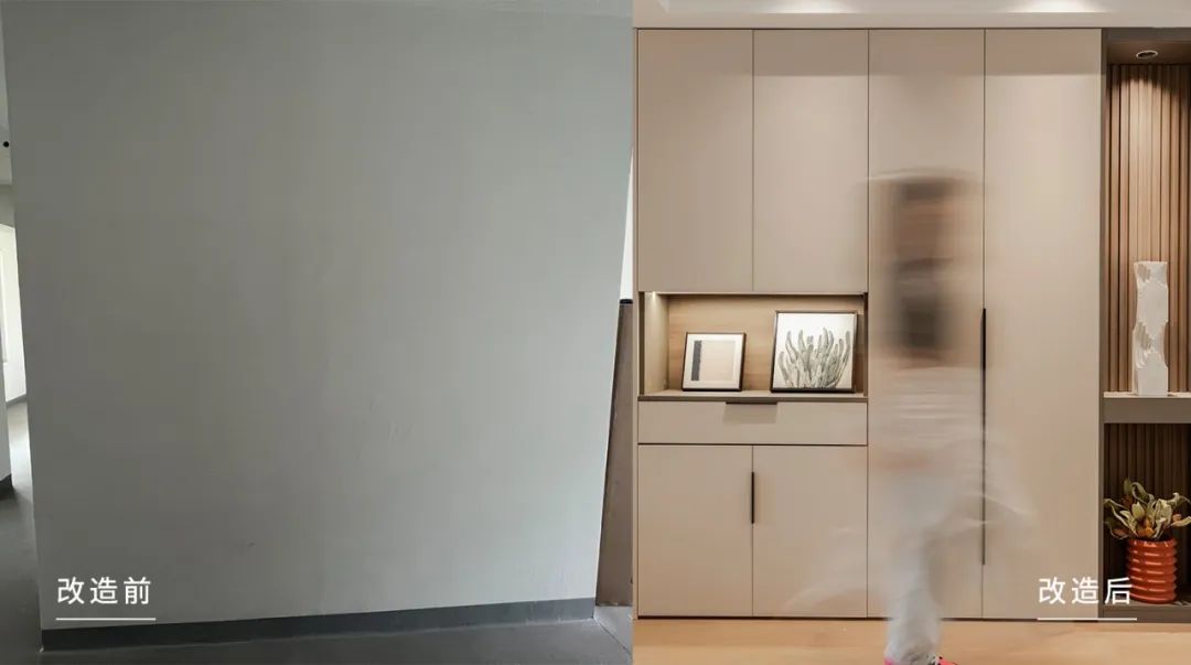 本案进门正对玄关墙,实用性较低且单调,于是做了装饰性玄关柜的设计,增加收纳的同时也能提升美观度。