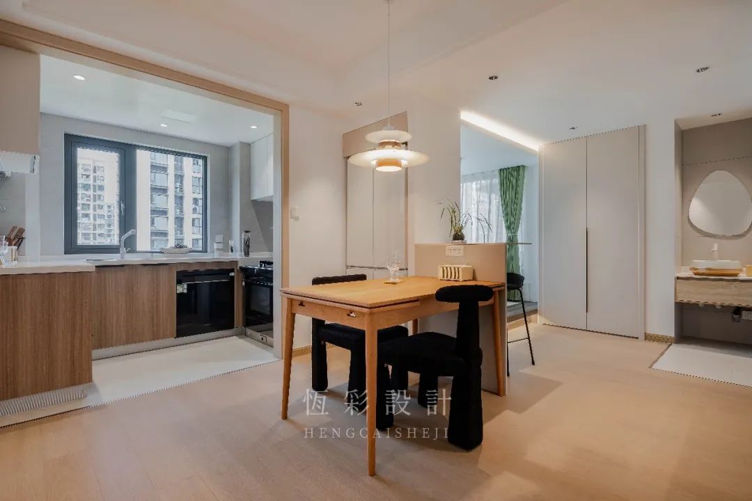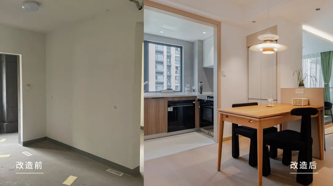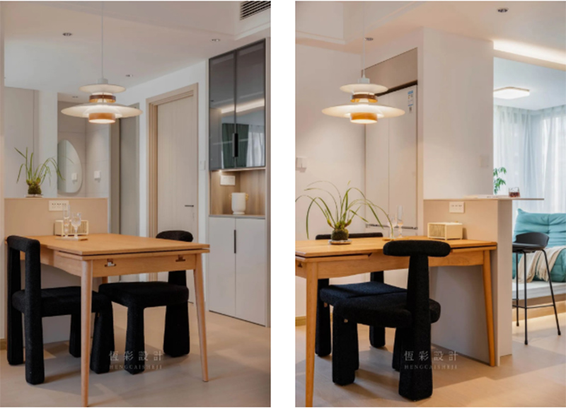 餐厅部分敲掉了原本的整墙,改做半墙设计使得原本阻隔的视线豁然开朗。同时半墙上也可简单置物,颜值、实用兼得。