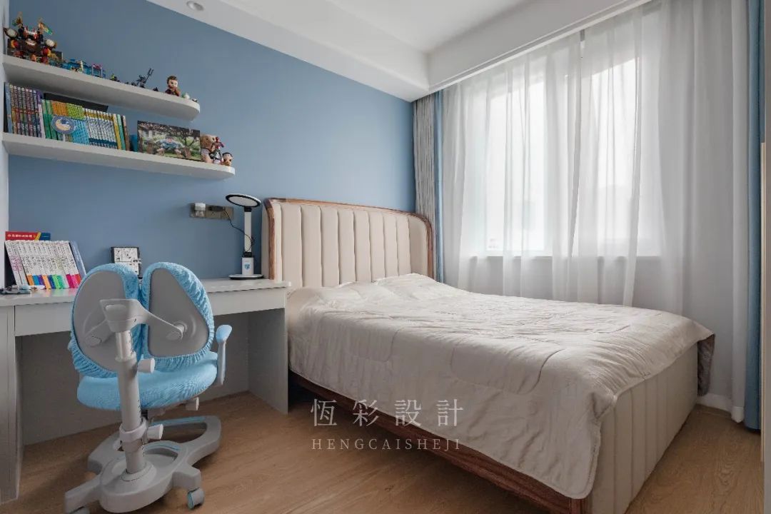 床尾定制书桌+置物隔板,简单的布局,更凸显设计本身的功能性。