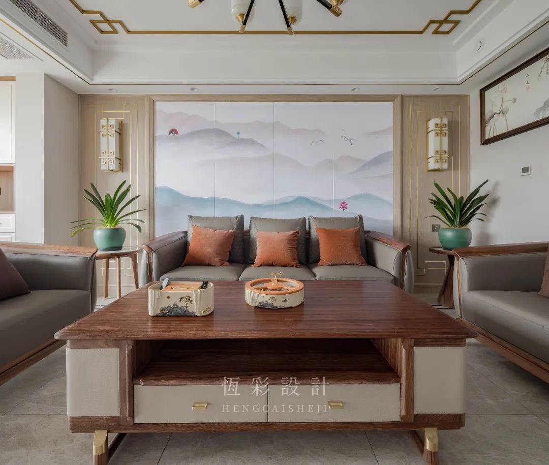 沙发背景墙做山水硬包,同时左右两边对称,木饰面以金属线条元素做出造型,中式风点睛。