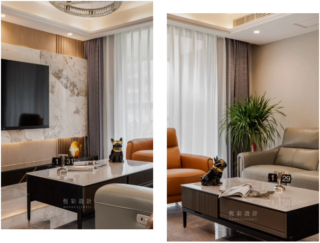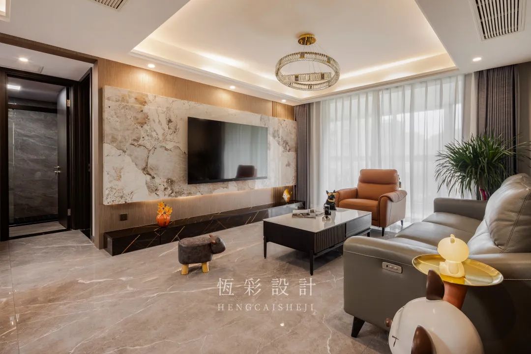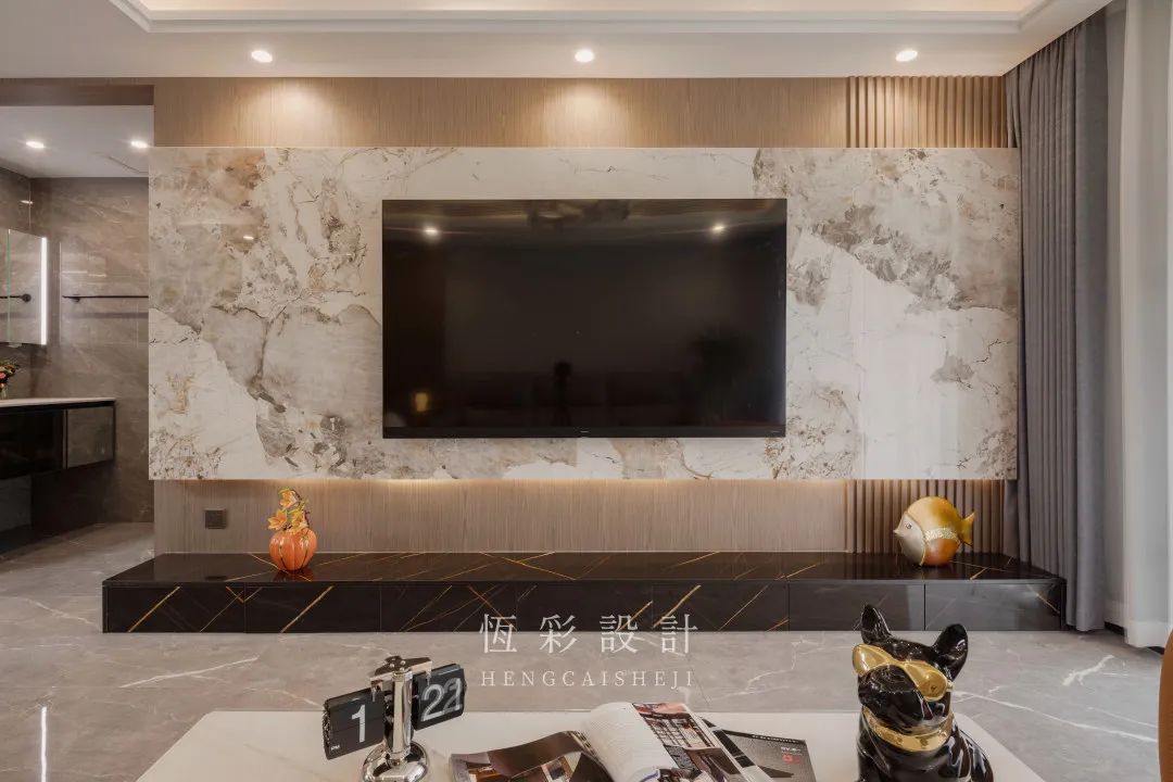 整块岩板做电视背景墙,木饰面拼接格栅做底板,霸气十足,相当有范儿!