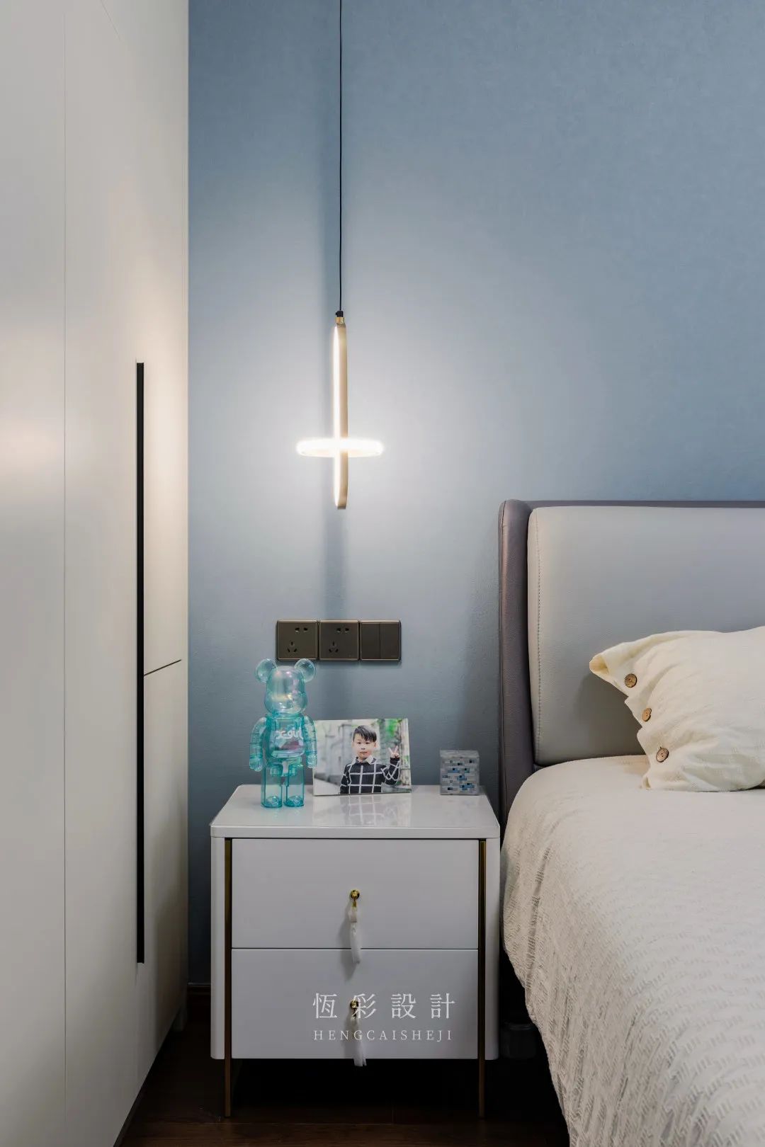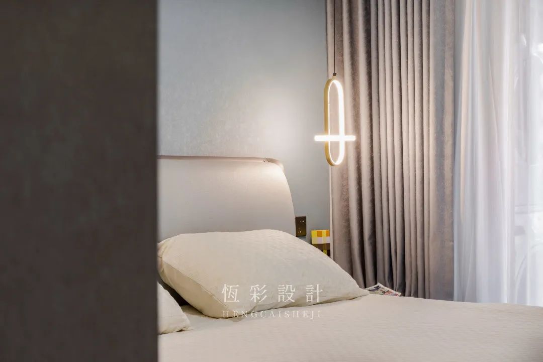 衣柜配色与客餐厅柜体一致,避免视觉上的杂乱感。对称的吊灯替代台灯,时尚感up。
