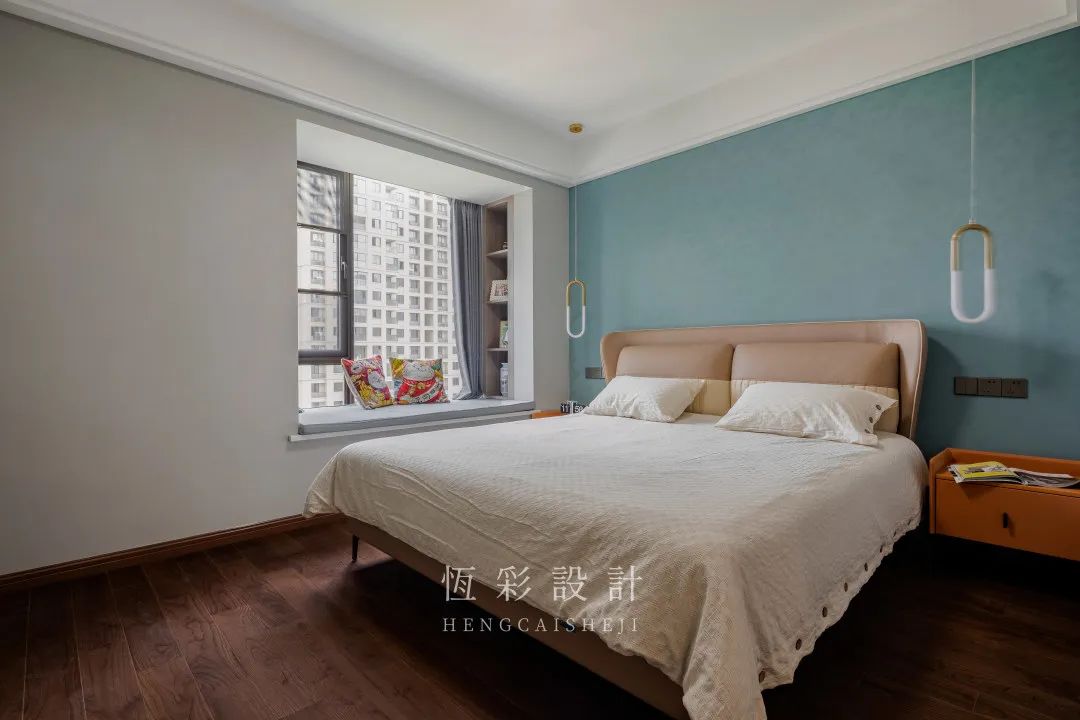 主卧硬装上不作复杂造型,飘窗打造休闲区,定制飘窗垫、靠墙定制收纳格,偶尔倚靠晒晒太阳、看看书很不错。
