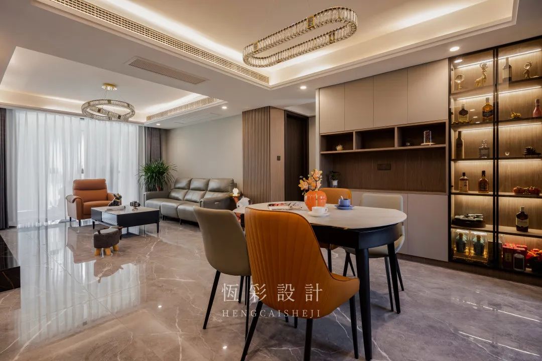 现代感的大理石餐桌椅颜值高又实用,轻奢范儿的餐厅水晶灯格外精致,又为餐厅增色不少。