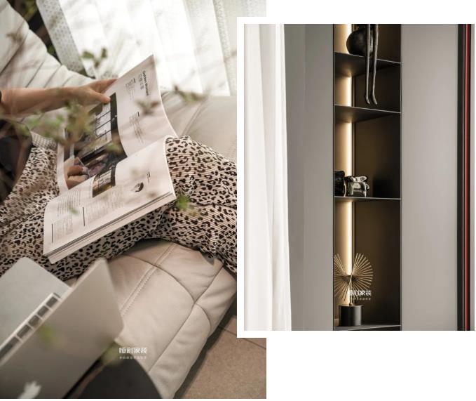 最外侧留了一组柜子做开放式包包柜,咖色玻璃柜门配合灯带设计,不仅可以避免落灰,颜值也很高,日常使用的时候也很方便。主卧背景是硬包,嵌入了局部黑色哑光不锈钢