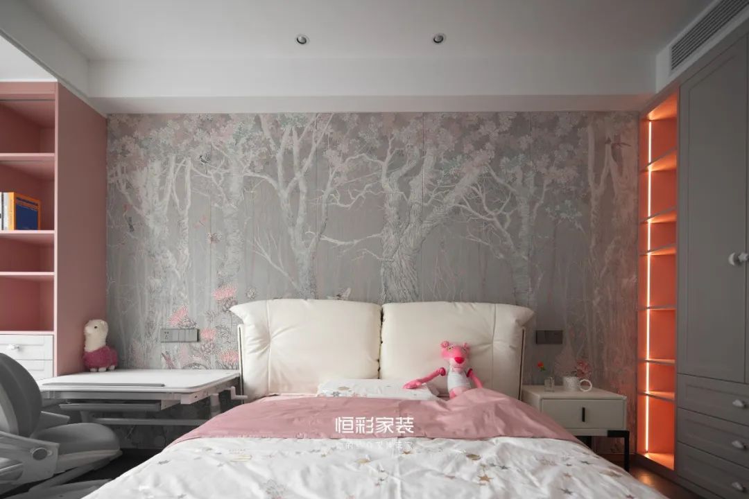 家里是女宝宝,所以儿童房整体色调采用了灰白粉,既温柔淡雅,又不失格调。壁画硬包床头背景,为整个空间增加质感。