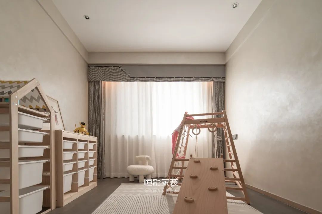 考虑到目前女宝的年龄阶段,屋主特地腾出了一个房间给宝宝作为玩耍的空间。墙面采用米色的意大利艺术涂料,给宝宝营造一种温馨的氛围,墙面也好打理,Faroro牌的攀爬架为宝宝提供娱乐项目。