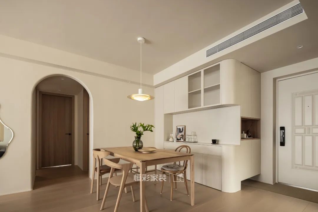 原木餐桌椅与奶油调背景色相得益彰,通往卧室的弧形过道门洞,搭配木色家具,增加了空间想要打造的柔和感。客餐厅墙面使用云朵墙贴镜作穿衣镜使用,同时不同的空间映射效果还能增加空间感。