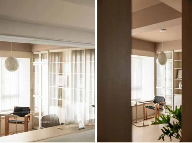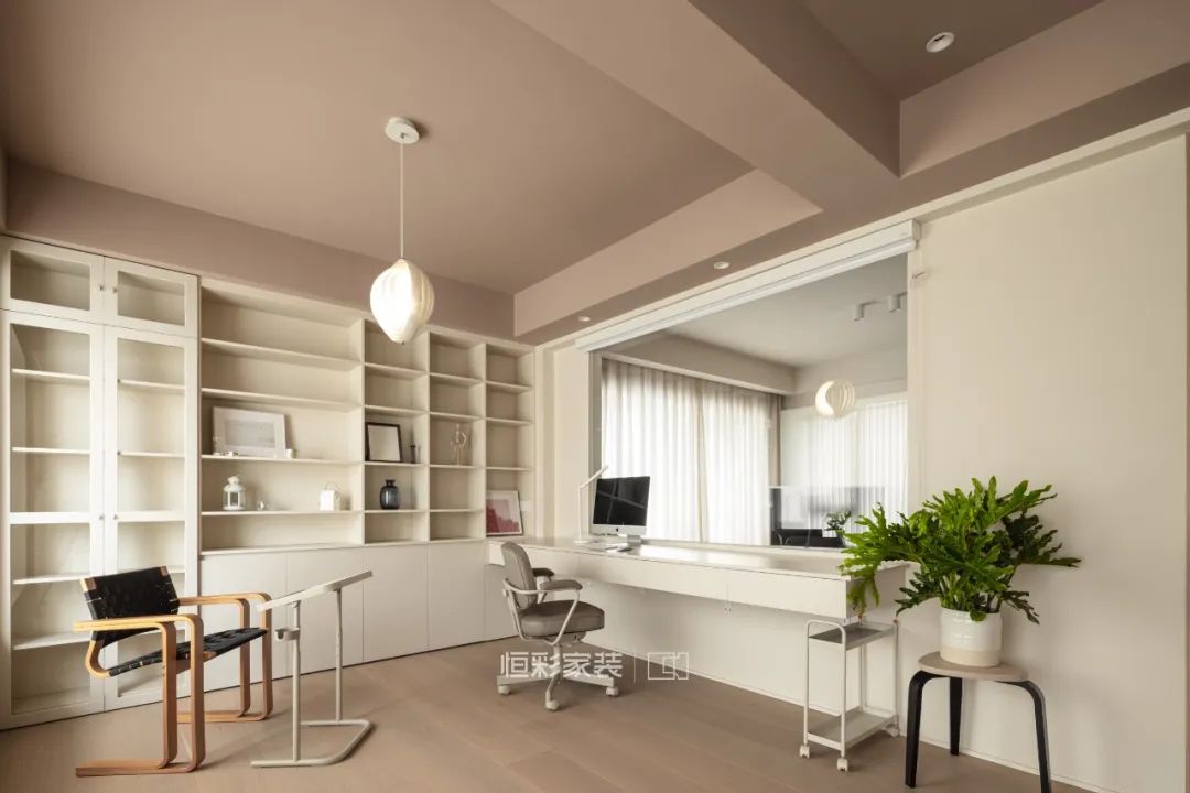 主卧墙面和书房顶面颜色统一,增加了空间的整体性和互动性。