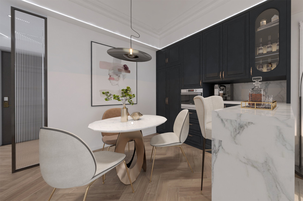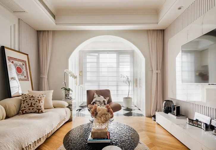 法式复古风格通常是具有雕刻和曲线的,以典雅和精致为主。吧台将原本一体化开放式的客餐厅隔开,从餐厅望向客厅,拱形门洞拿捏法式精髓,精致而充满仪式感。