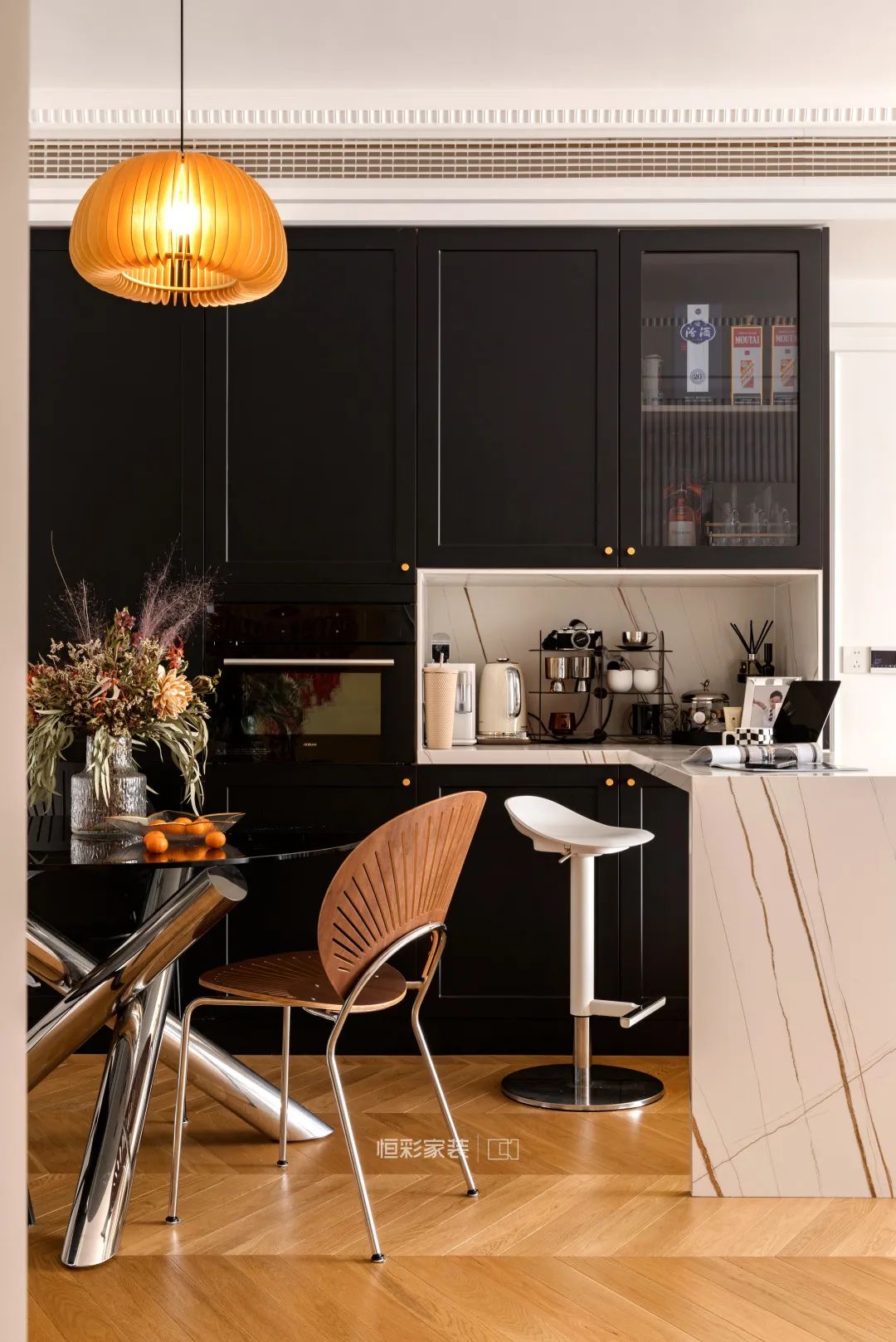 客餐厅中间采用吧台做衔接,增加互动性,同时也兼顾到女主人的居家办公需求,悬空吧台发挥实用性也不影响不同功能分区之间的空间连接。
