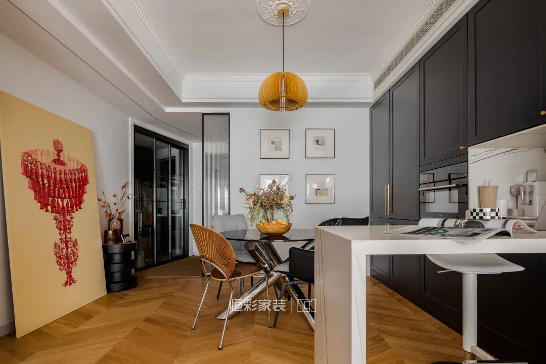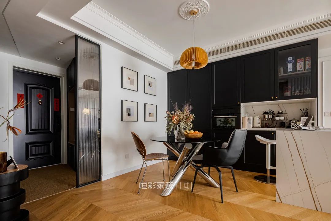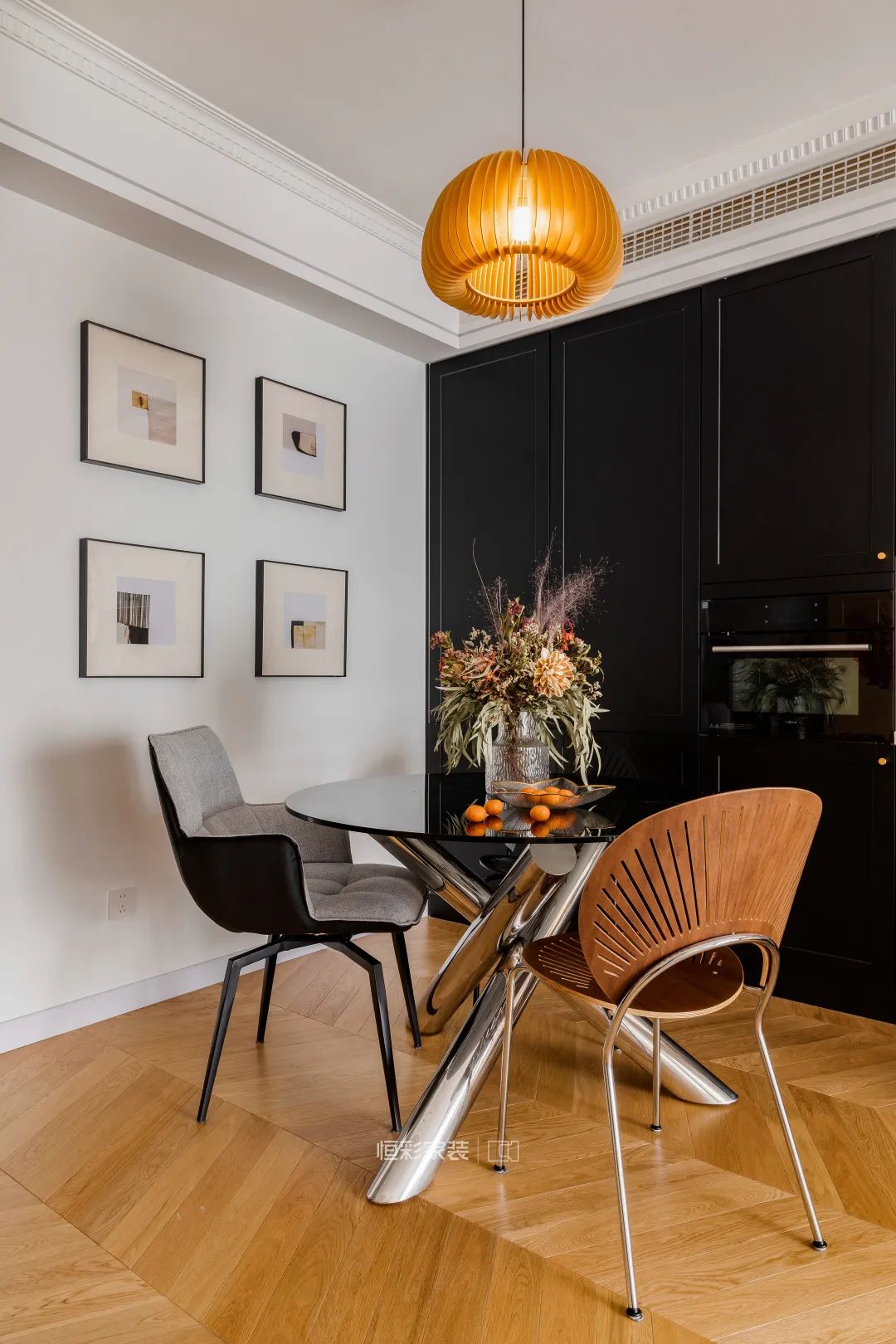 进门就被黑色草帽吊灯吸引,与众不同的造型时尚优雅,搭配石膏雕花的灯座,小小物件点缀出浓厚复古感,精致又高级。