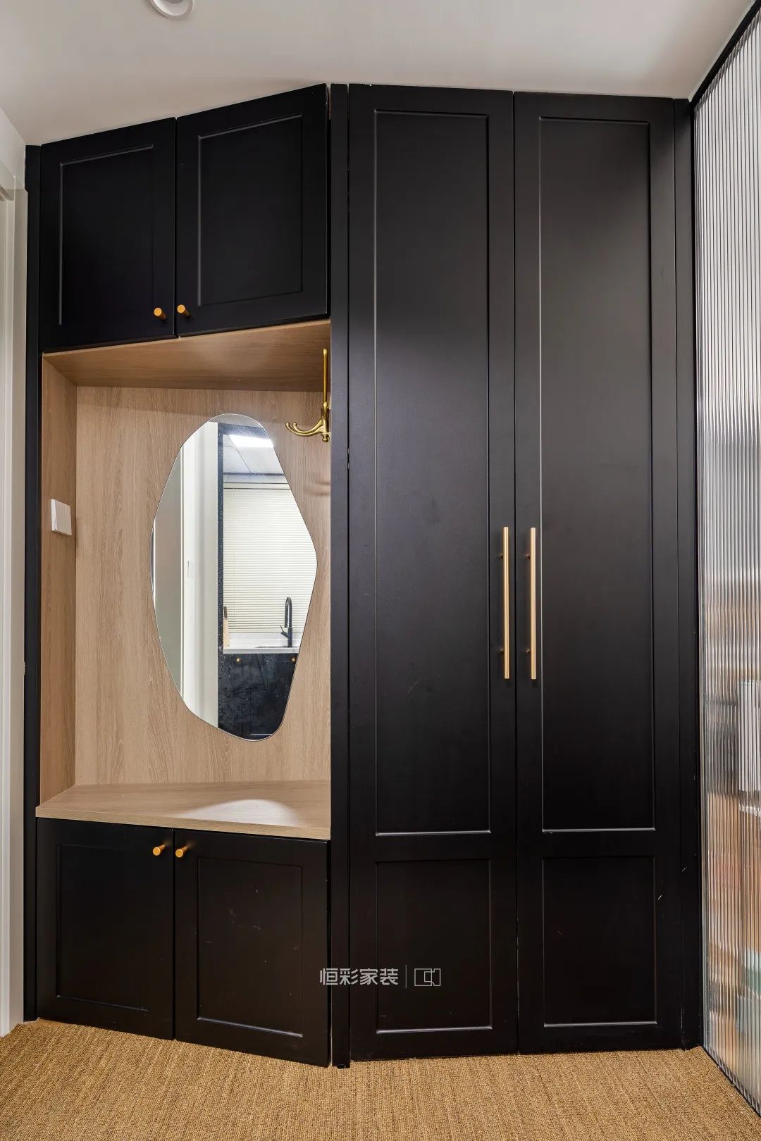 入户直通阳台没有遮挡,玄关做了异形设计,增加收纳的同时自然过渡到客餐厅,兼顾整体布局。玄关柜整体是黑金配色,自然肌理的木质与黑色定制柜气质复古沉稳。不规则无边框穿衣镜创意加分,与异形玄关简直是绝配。