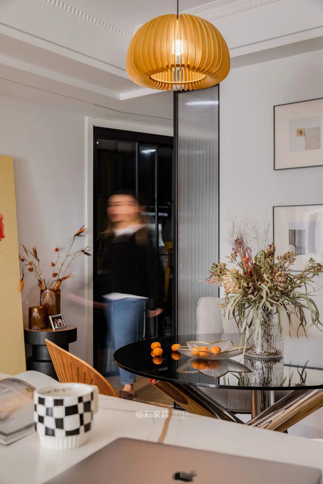 餐厅配色以黑白+明黄为主,软装点缀也很出彩,木艺南瓜吊灯复古文艺,质感温润,提亮整体亮度和暖意,带来强烈的浪漫气息。