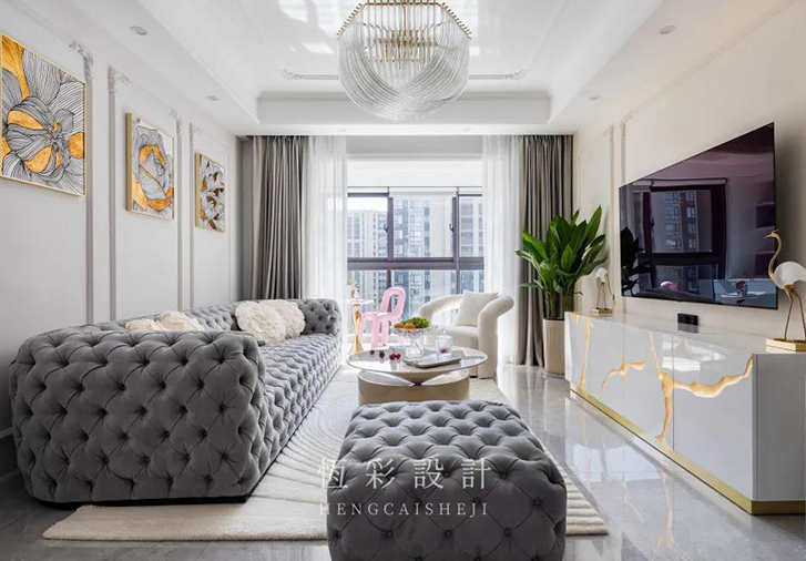 沙发背景墙选择米色乳胶漆,三组法式雕花石膏线装饰,搭配三组黄金花线条纯手绘装饰画装饰,黄色作为装饰主角色,与另一边的鎏金色电视机柜纹理相呼应。