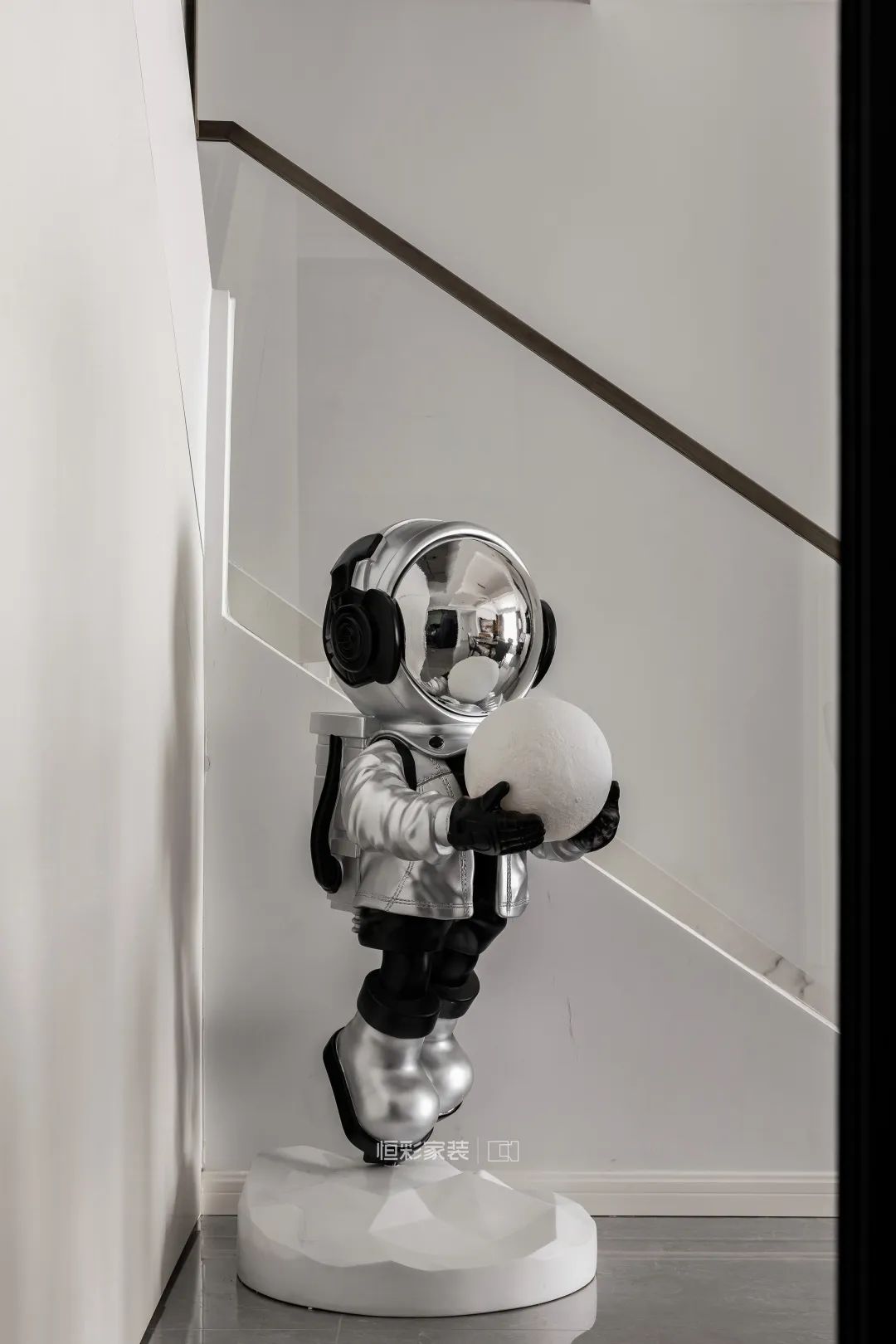 同时利用楼梯处留白空间,做了一个端景设计,摆放大型宇航员摆件,增添时尚感、未来感。