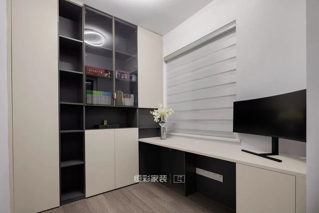 书房主要作为业主在家办公所用,风格相对更商务范儿一些,定制展示柜&书柜作为补充收纳区,黑色玻璃柜门低调高级。