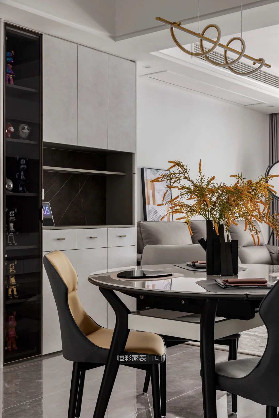 轻奢风的餐厅吊灯,搭配大理石餐桌超有氛围感。白色大理石纹餐桌小有轻奢味道,圆形餐桌聚合人气,一家人围坐在餐桌旁感受家的温暖。同时也中和了吊顶带来的棱角感。
