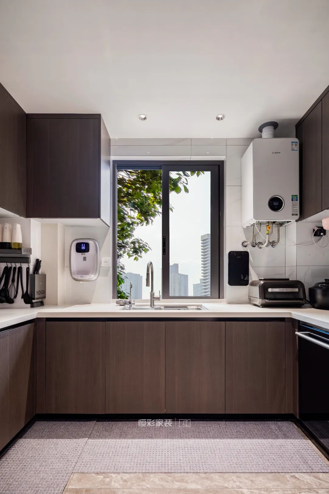 厨房整体设计偏现代风,更重视使用便利性、实用性,不管是地砖还是橱柜都以深色系为主。