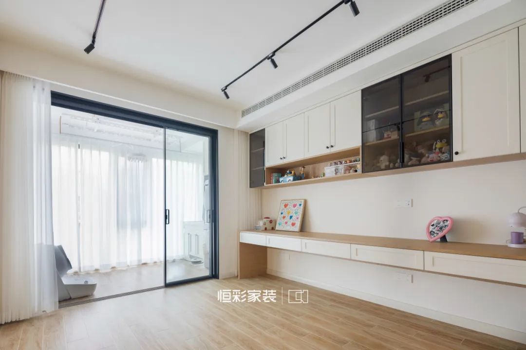 屋内定制吊柜+L型悬浮书桌,奶油+原木柔和干净,其他区域大面积留白,灵活可变,提升整个空间高级感。