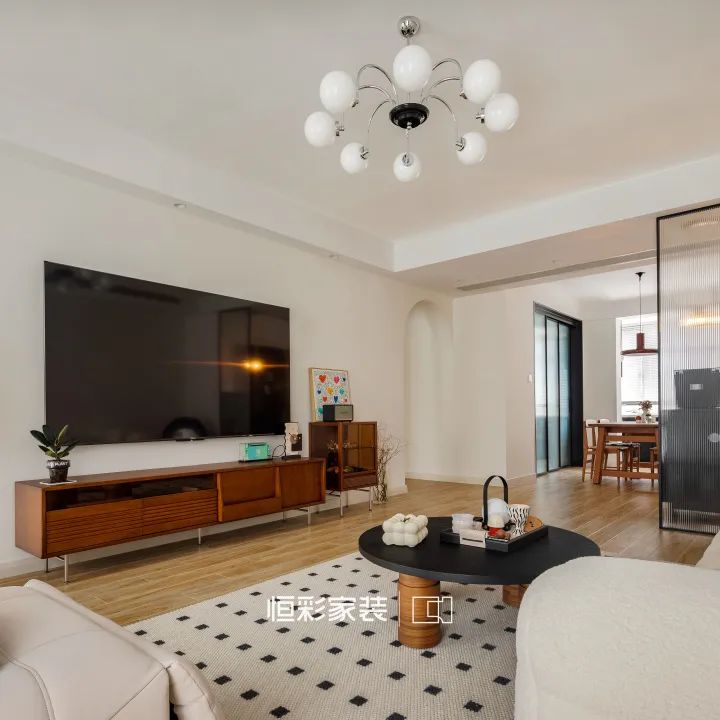 客厅硬装简约处理,细微处又不乏惊喜,平吊顶、大白墙干净简洁,为柔和硬装线条,阳台吊顶处与走廊门洞都选择户型处理。