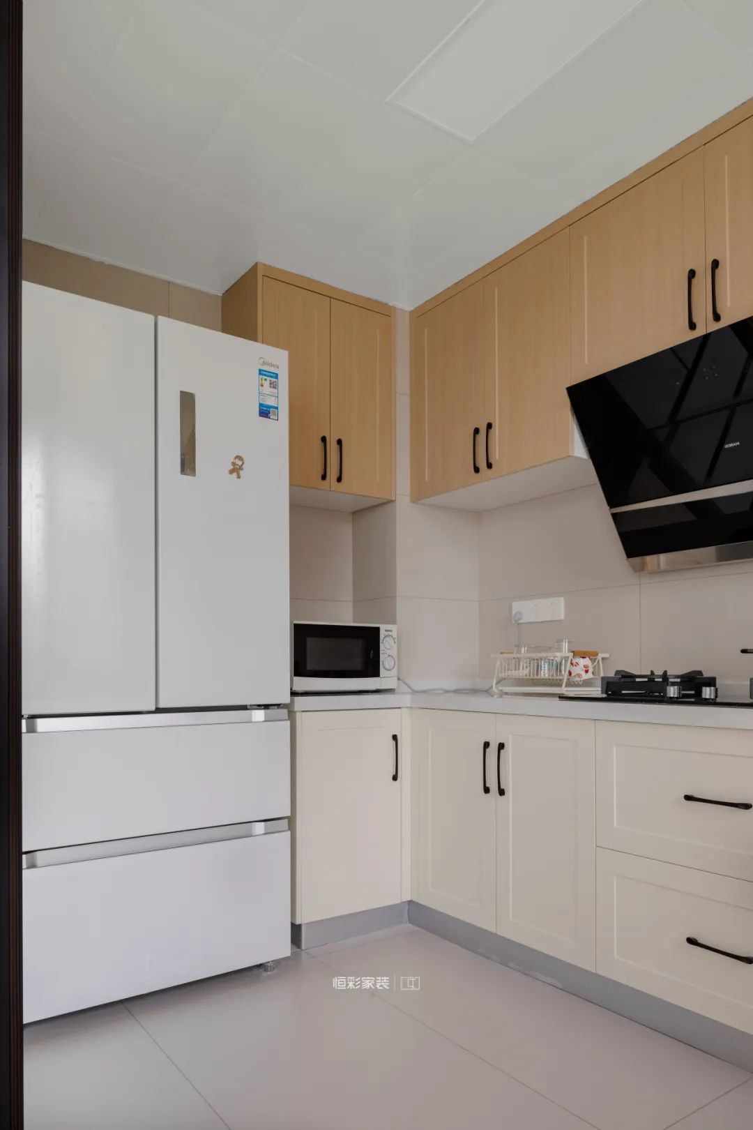 厨房地面与橱柜都是浅色系,柜子定制了温柔的原木+奶白色搭配黑色把手,与橱柜错落布局显得空间宽敞明亮,台面充足。