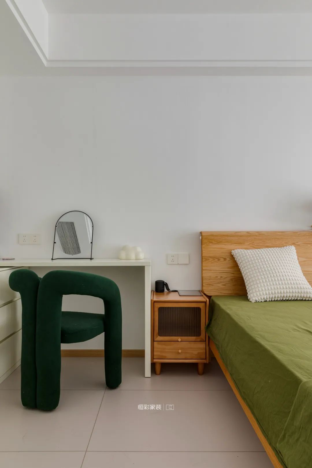 主卧软装同样以原木为主,这个暖焦糖色真的超美,在大面积白色衬托下明亮温暖,大气舒适。