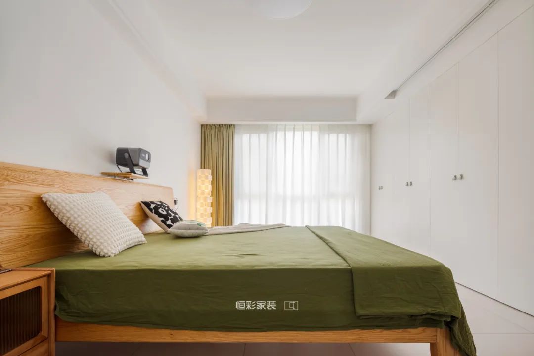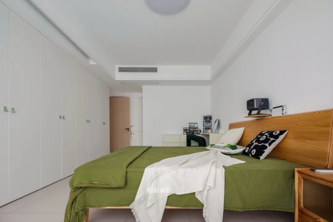 女屋主对主卧衣物收纳有很大需求,进门处与床尾设计两组衣柜,再多衣服也能容纳。吊顶处还预留了投影幕布的位置,后期增设投影。