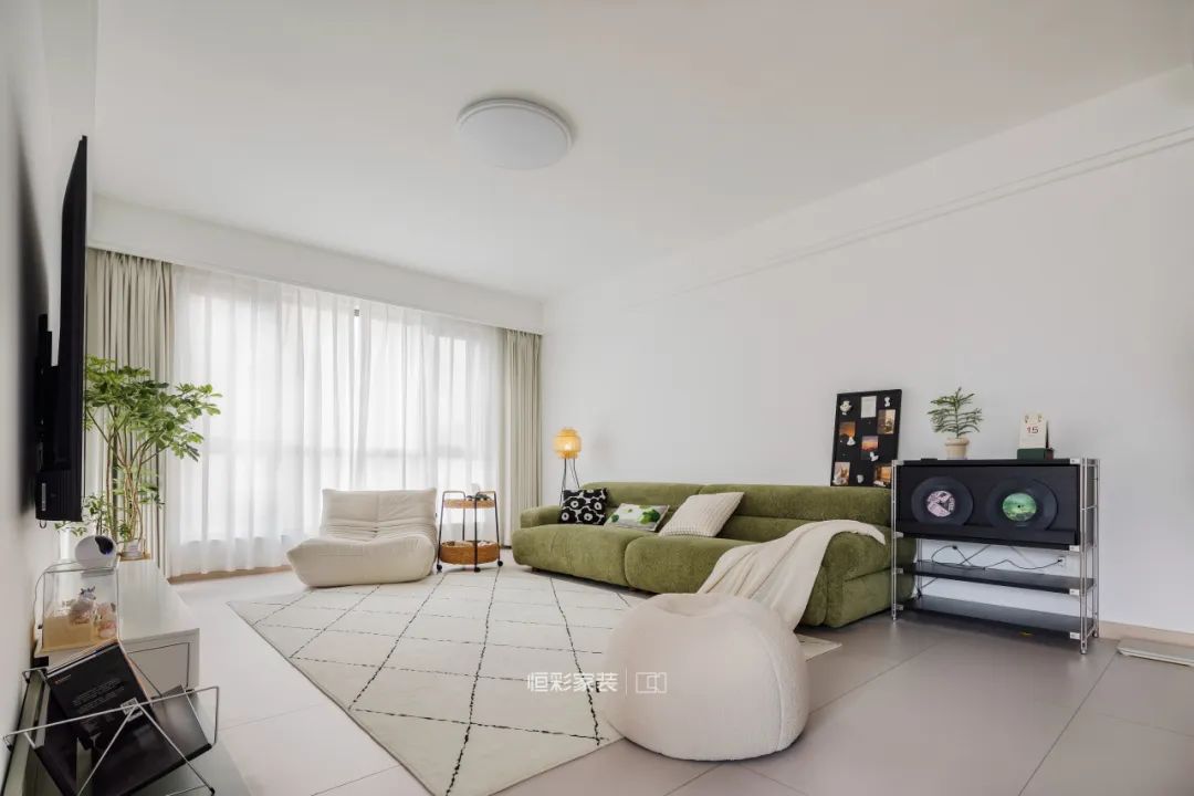 客厅以简约而温馨的设计风格为主,软装结合业主对艺术和音乐的热爱,呈现出独特的氛围。墙面采用了大面积的白色涂料,为整个空间增添明亮感和空旷感。