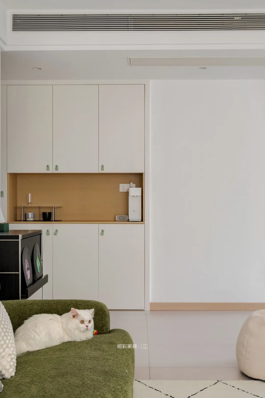 文艺与自然,是本案呈现的整体气质。从硬装到软装,大面积留白与复古绿的搭配尤其清新淡雅,原木的质感和奶油色的柔和完美烘托原木奶油风的浪漫氛围。