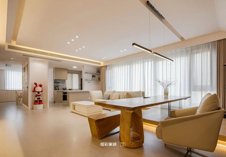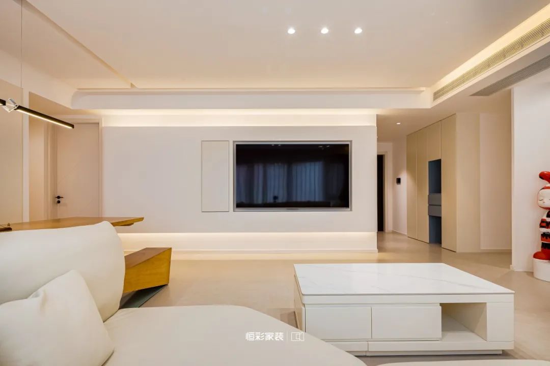 客厅整面大飘窗,自然光线充足地洒入室内,光影交错间使整个空间显得格外明亮和通透。无主灯设计简约又不失大气,隐藏光源营造出柔和的氛围,奶呼呼的白色布艺沙发如同一片温柔的云,带来无限的舒适感和温馨感。