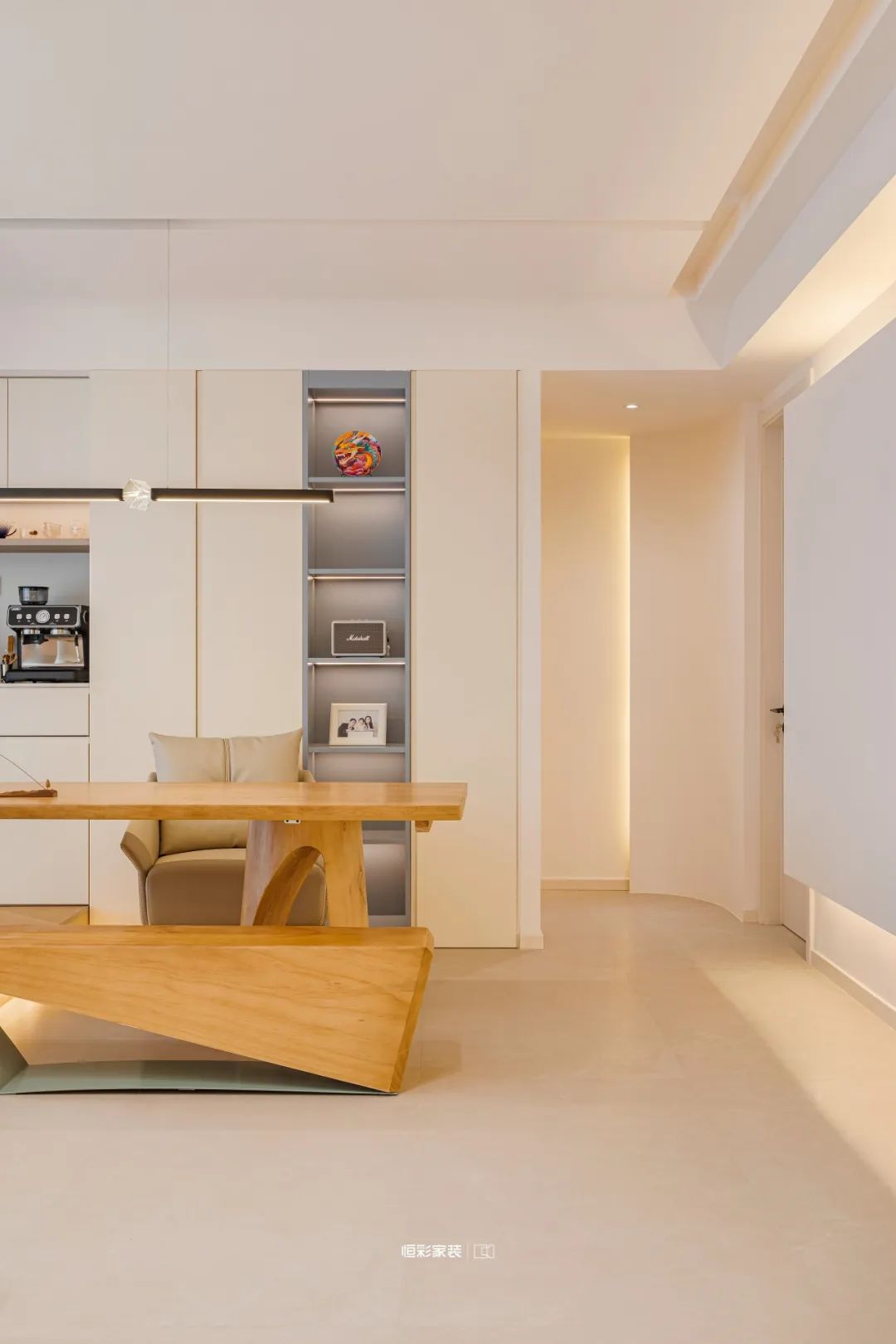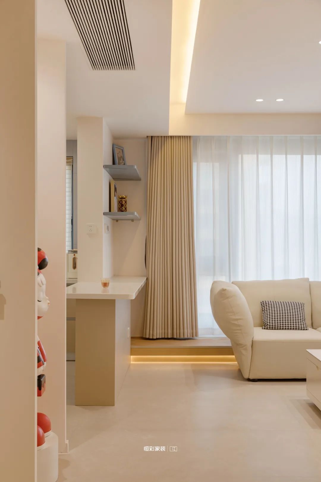电视做嵌入式处理,与隐形柜门巧妙结合,使墙面保持整洁和统一,客厅看起来更加宽敞透亮。客厅与厨房之间采用吧台作为隔断,增加两组开放收纳格补全视觉上的空缺,这一设计不仅有效区分了功能区域,同时保持了空间的通透感与整体性,使视觉上更加宽敞连贯