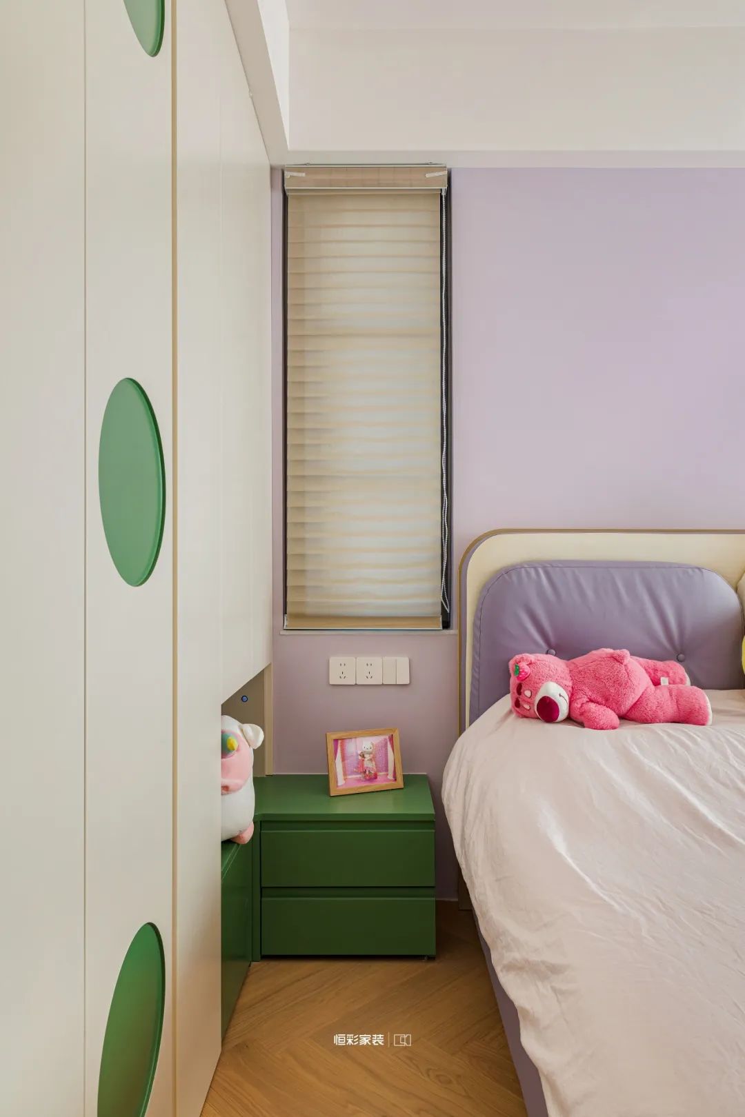 儿童房设计充满了童趣与可爱,以活力的紫色和粉色为主调,充分尊重孩子的喜好,打造出一个梦幻般的空间。柔和的紫色和粉色不仅给房间增添了一份温馨,还让整个空间显得生动活泼,充满了孩子的天真与幻想。